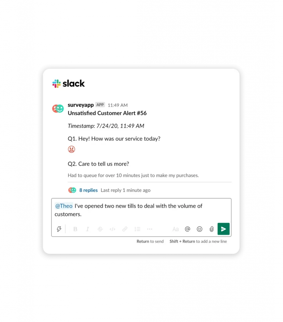 Distribute feedback promptly to the appropriate interface for every role. InRate sends information straight to our Manager app, TV wallboards and dashboards, Slack channels, Teams, and systems like Salesforce.